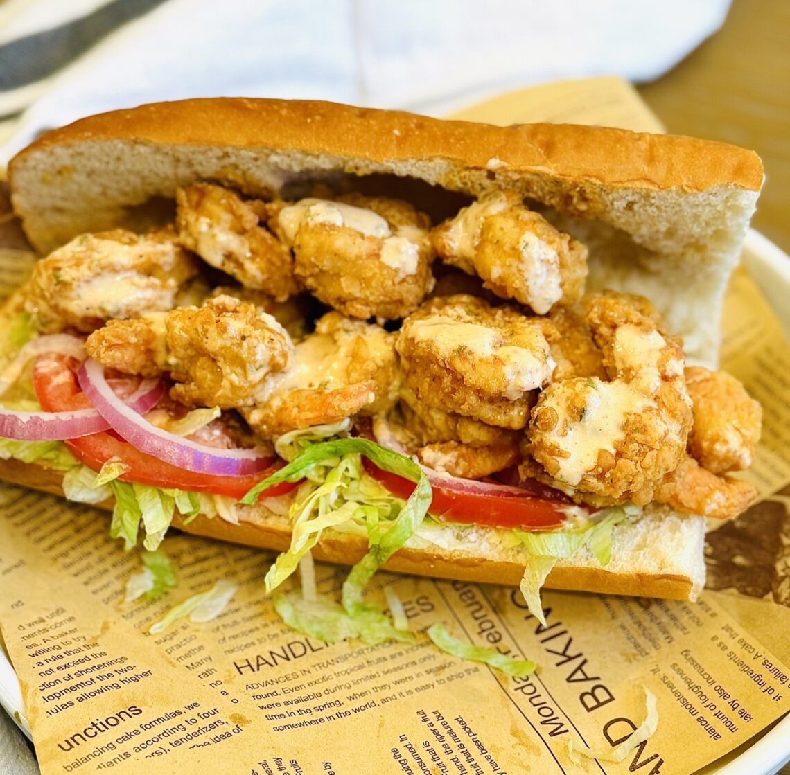 A shrimp po’ boy is a classic Louisiana sandwich that features crispy, fried shrimp served on a baguette-style roll, typically dressed with shredded lettuce, tomatoes, pickles, and a tangy remoulade sauce.