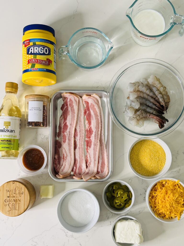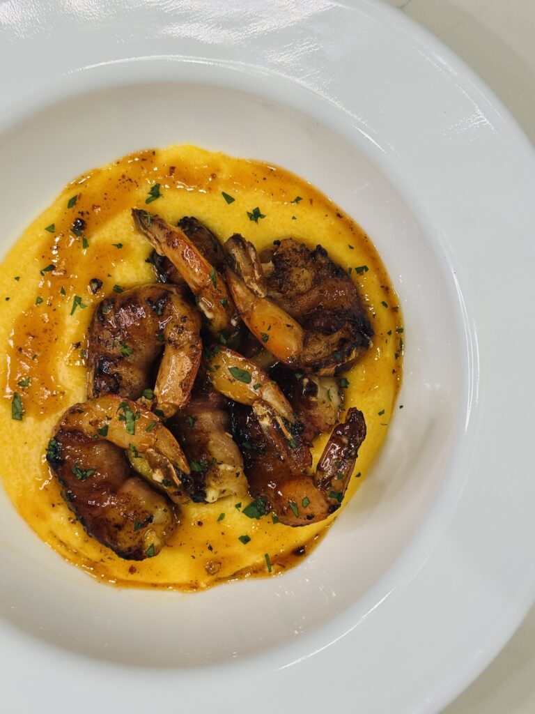 - Yellow corn grits – rich, buttery flavor and a slightly heartier texture than white grits—making them the perfect base for bold, flavorful toppings like bacon-wrapped shrimp and sweet chili glaze.