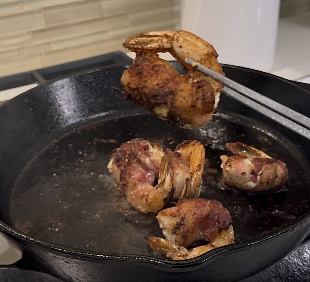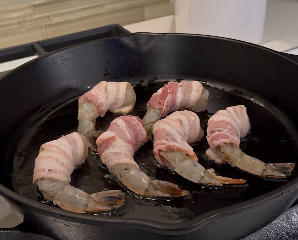 - Use tongs to gently turn the shrimp, searing each side for 1–2 minutes until all sides of the bacon are browned and slightly crispy.
