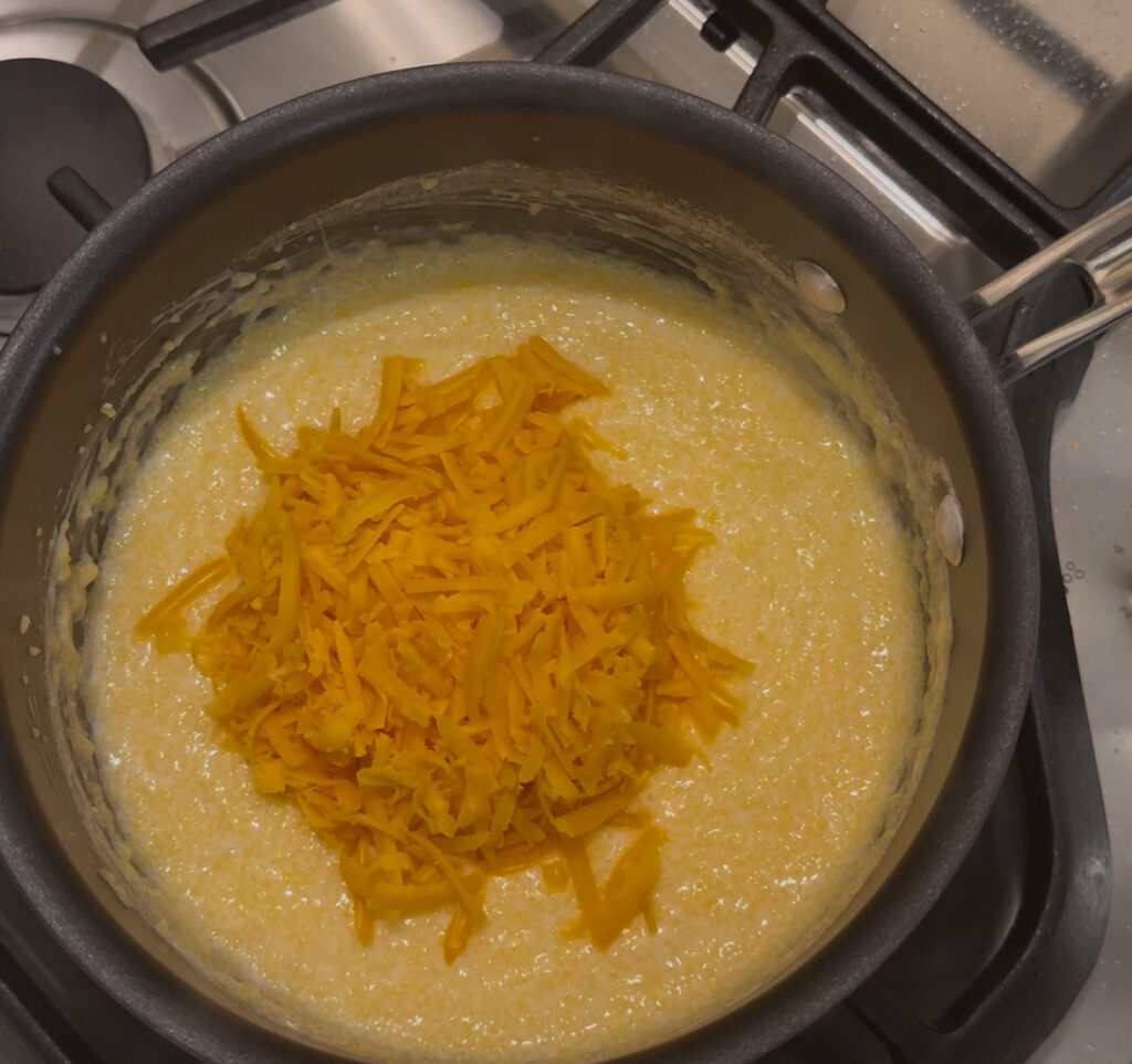 - Cook until thick and creamy (about 15–20 minutes), then stir in butter, cheddar cheese, salt, and pepper. Keep warm.