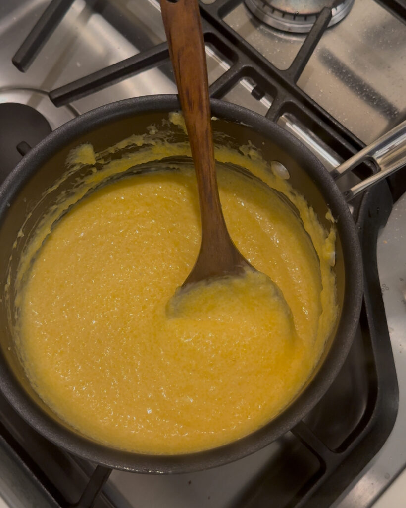 - Slowly whisk in grits, stirring to prevent lumps.